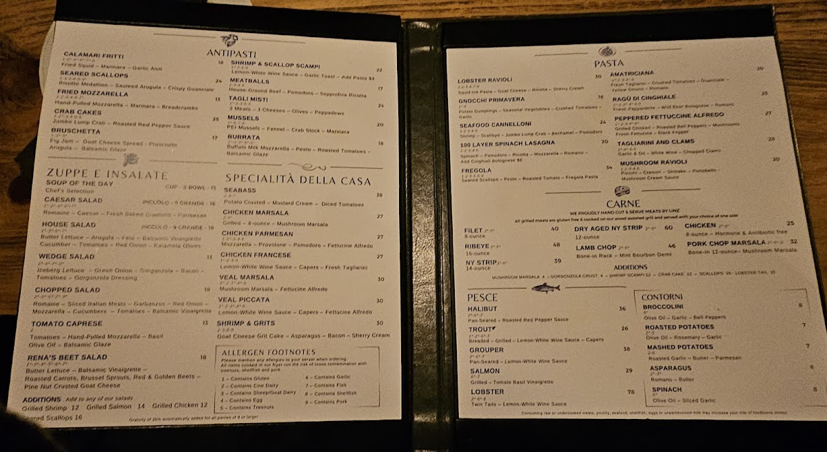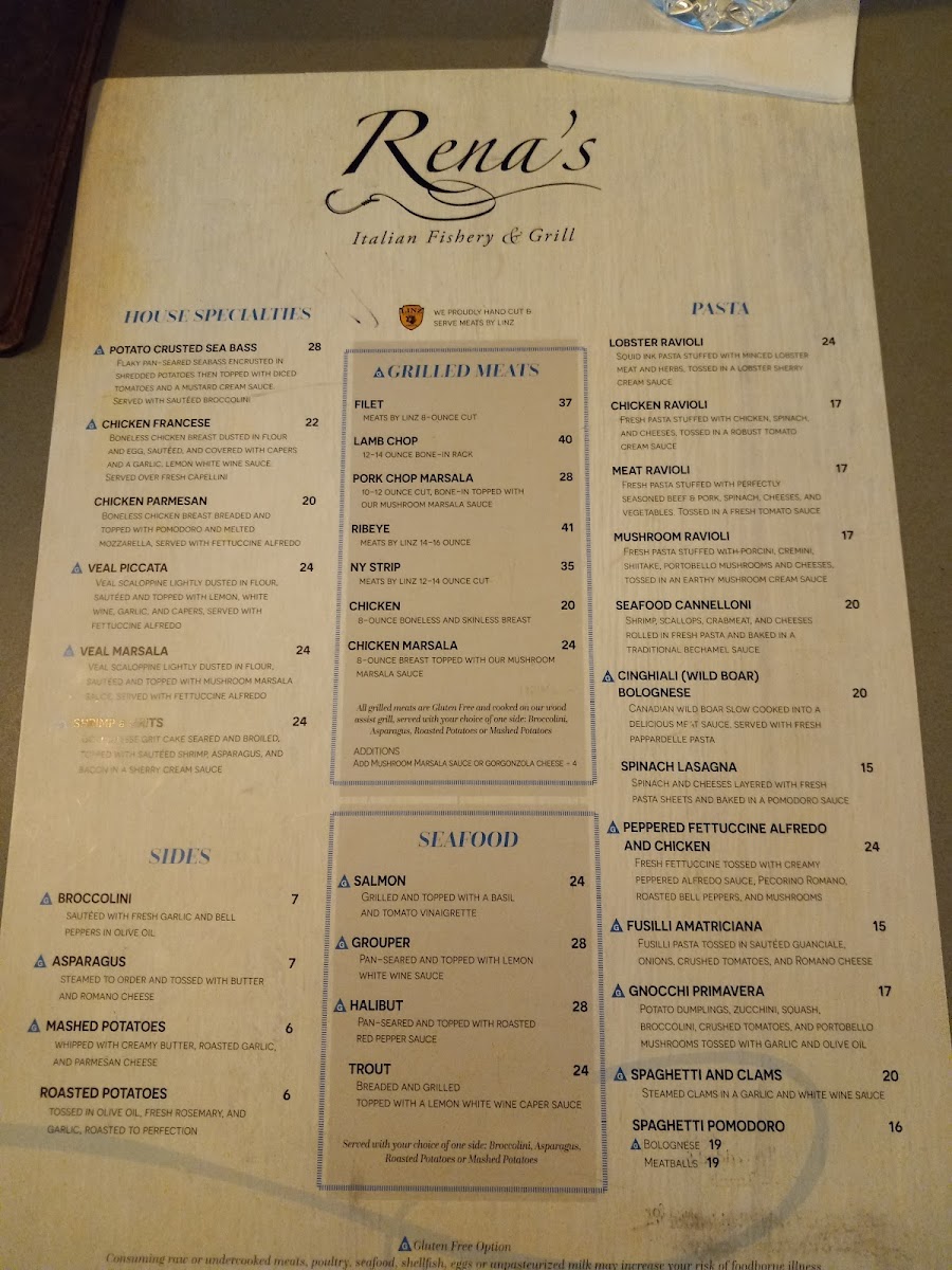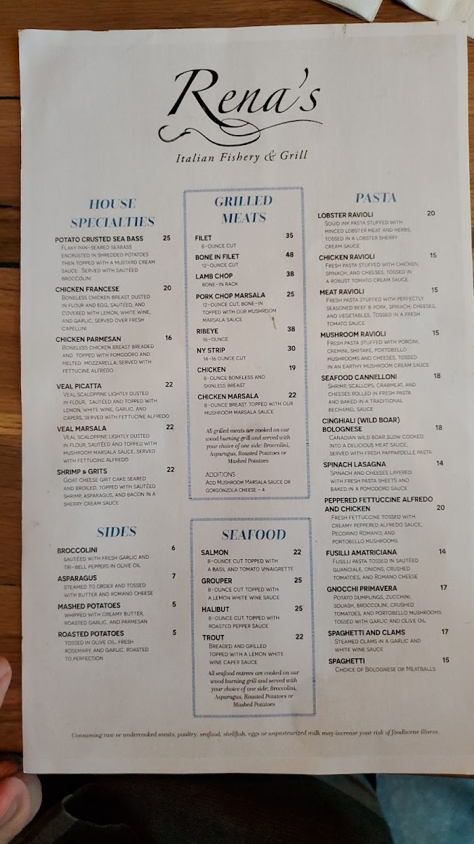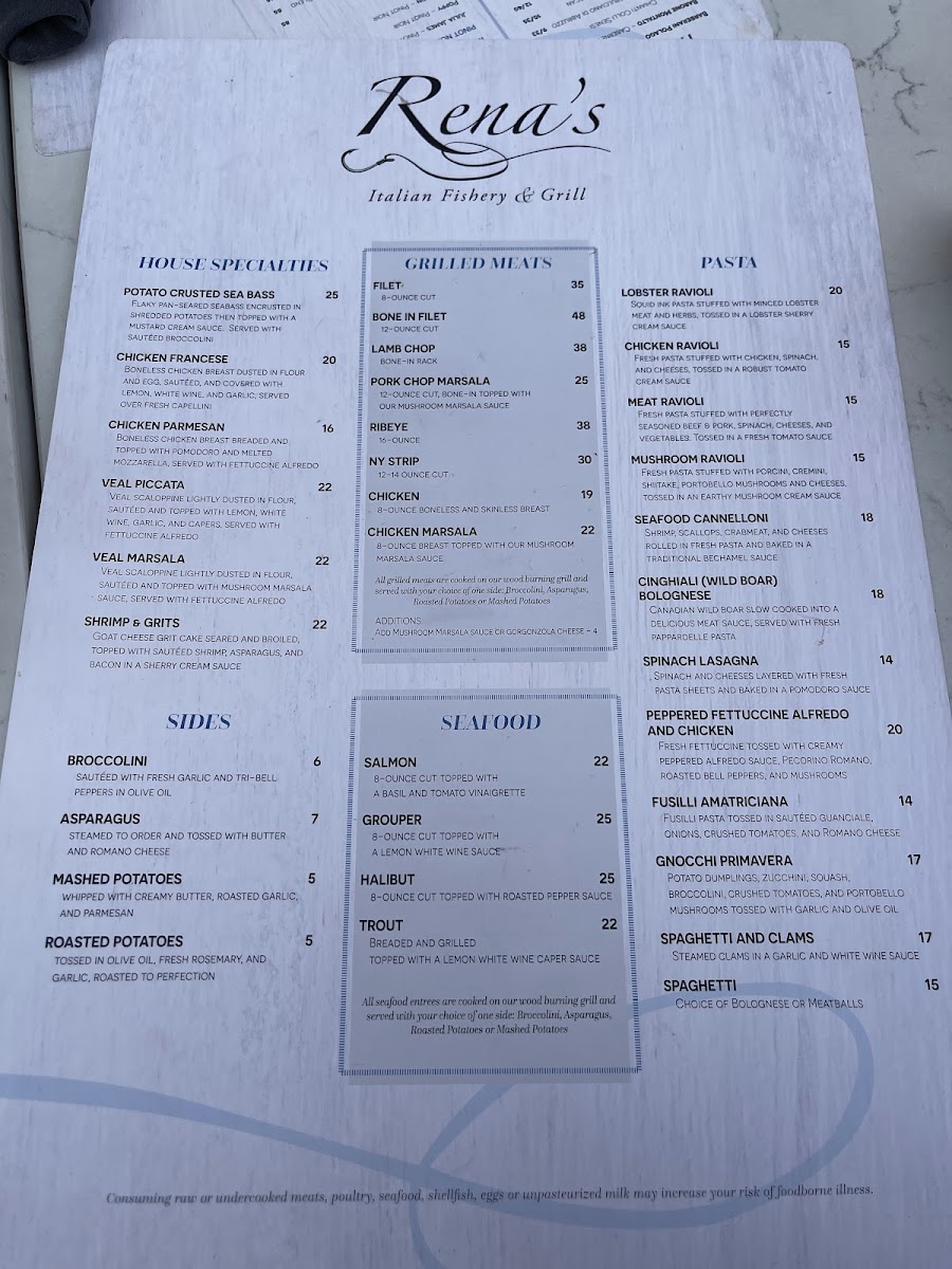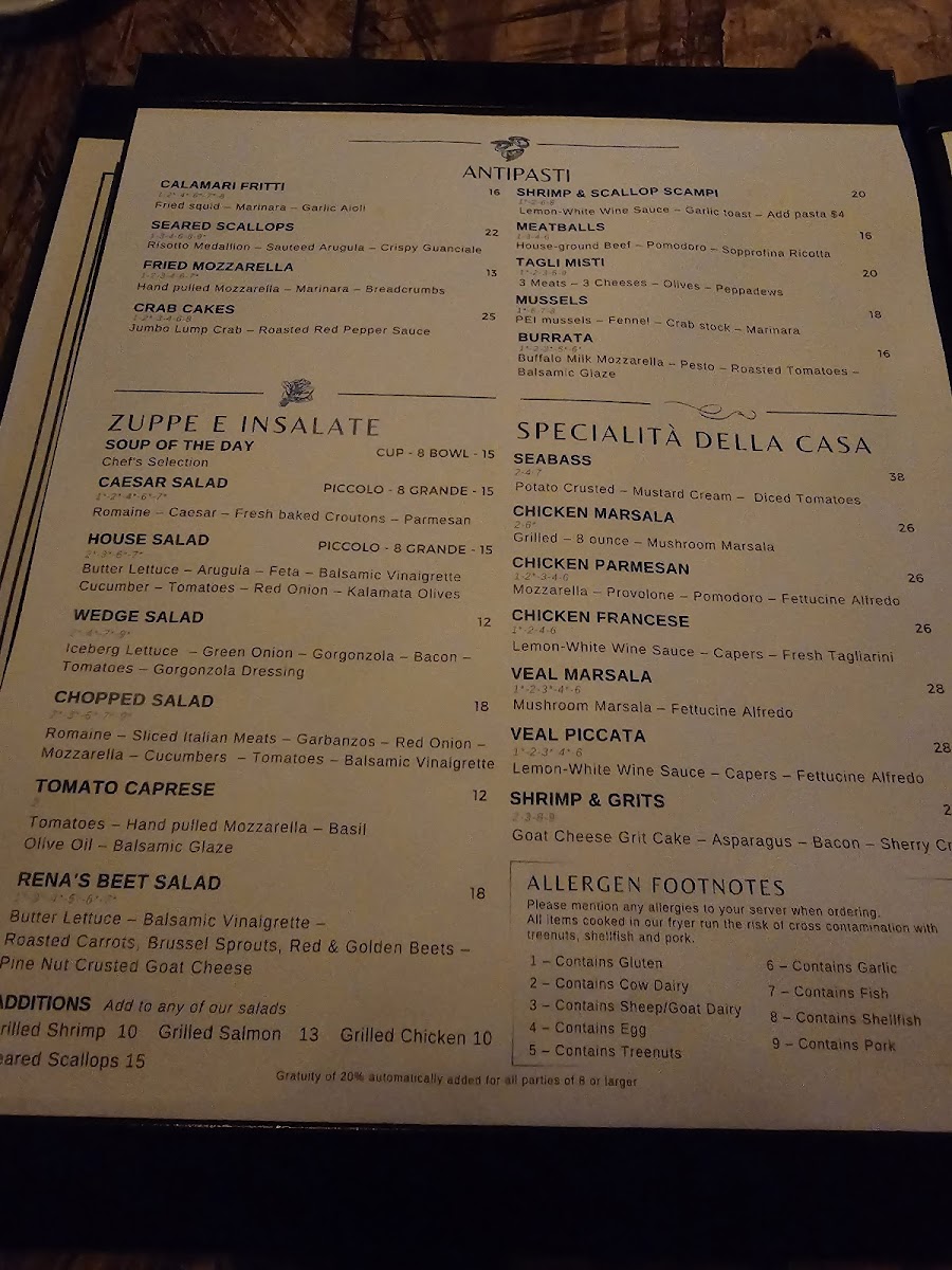 The menu at Rena’s Italian Fishery & Grill offers a thoughtfully crafted selection that blends classic Italian flavors with fresh, coastal influences. It strikes a comfortable balance between hearty, satisfying dishes and lighter, elegant options, perfect for a relaxed dinner or a casual night out. Whether you’re settling in for a rich plate of mushroom or lobster ravioli, savoring fresh seafood like the potato crusted sea bass, or enjoying simple yet flavorful starters such as calamari fritti or bruschetta, the choices feel approachable and well considered.