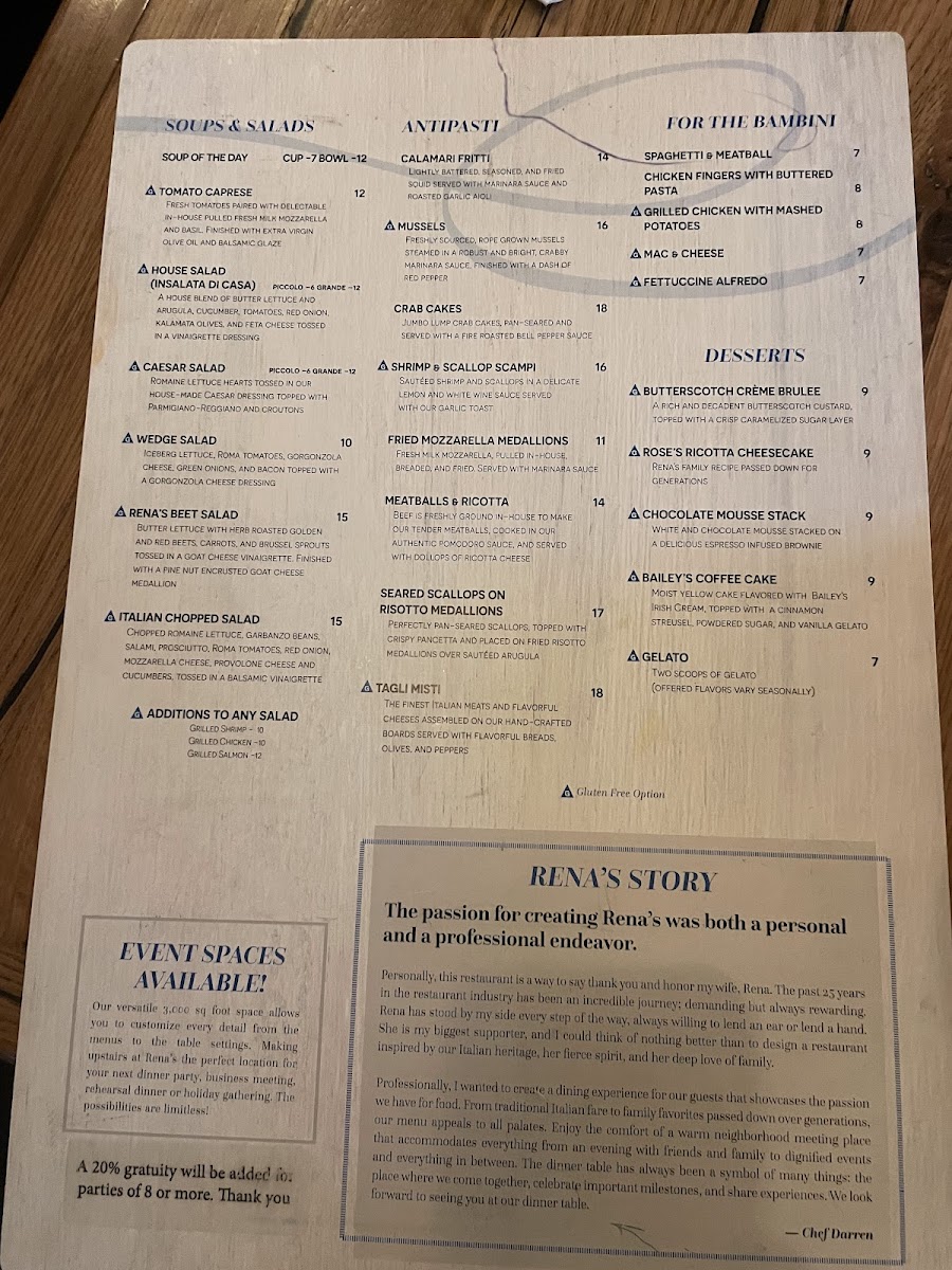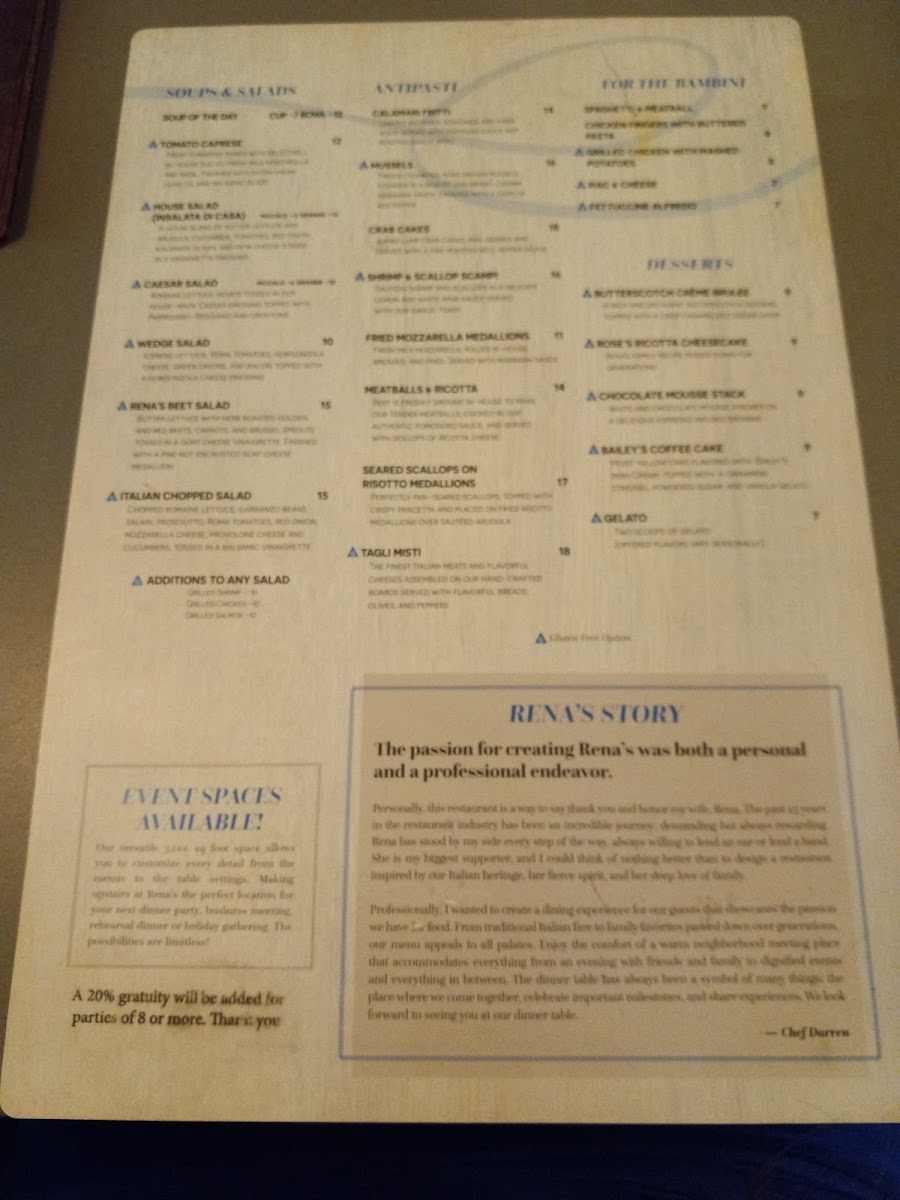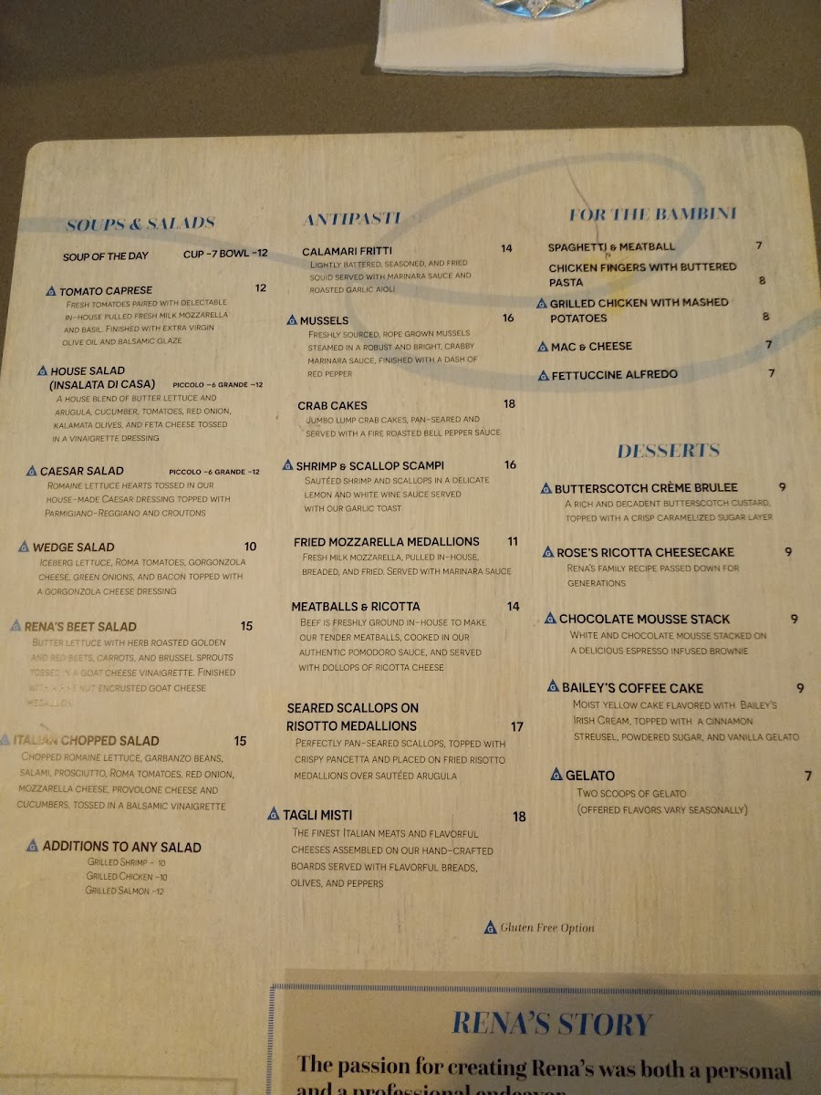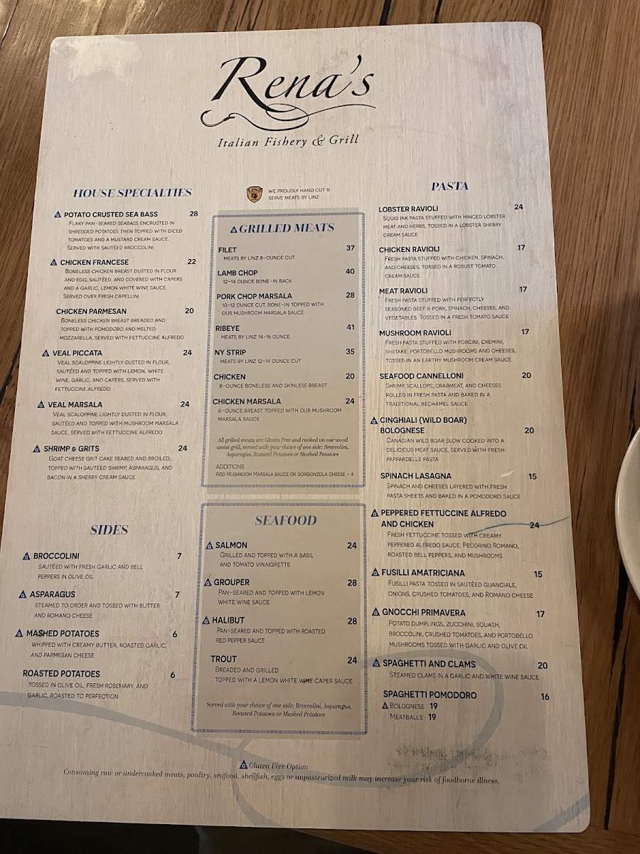 The menu at Rena’s Italian Fishery & Grill offers a thoughtfully crafted selection that blends classic Italian flavors with fresh, coastal influences. It strikes a comfortable balance between hearty, satisfying dishes and lighter, elegant options, perfect for a relaxed dinner or a casual night out. Whether you’re settling in for a rich plate of mushroom or lobster ravioli, savoring fresh seafood like the potato crusted sea bass, or enjoying simple yet flavorful starters such as calamari fritti or bruschetta, the choices feel approachable and well considered.